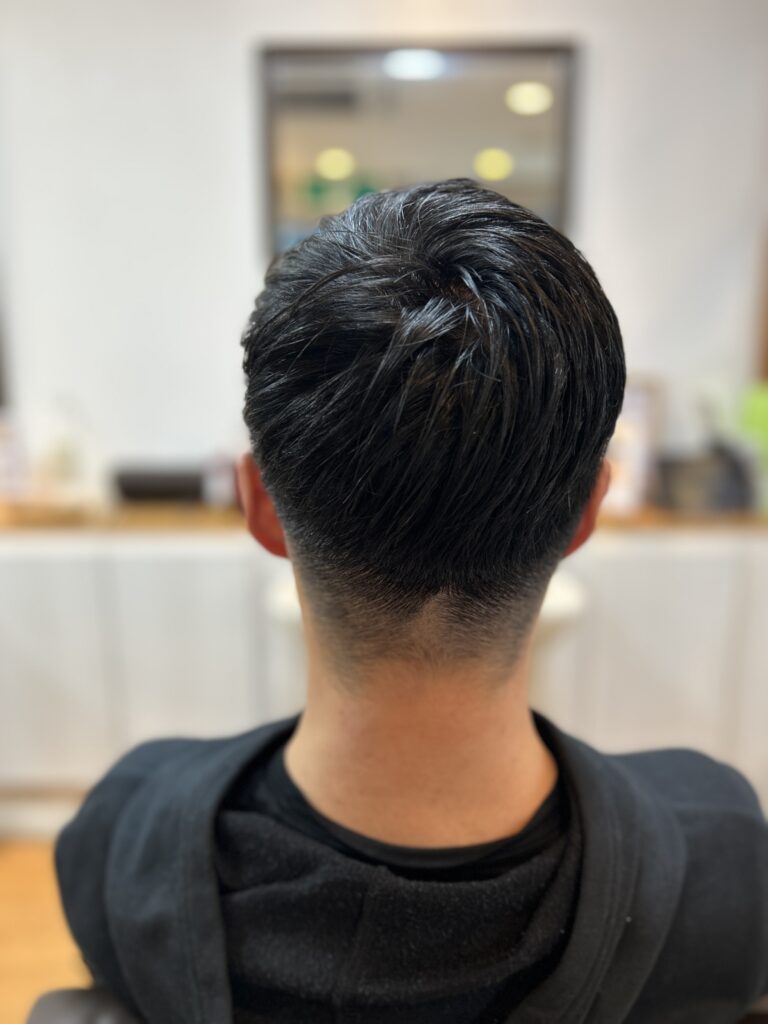 ∙ サイドから後頭部のすその部分をツーブロックで刈り上げ、生えグセを目立たなくする