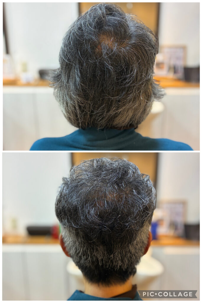 地肌が透けて見えるほどではないものの、分け目やつむじのあたりが気になる状態でした。