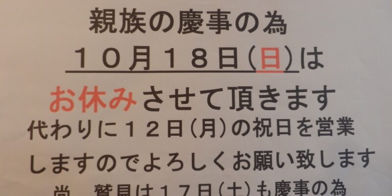 10月18日(日)に親族の慶事の為お店をお休みさせて頂きます。 代わりに12日(月)の祝日を営業します。 鷲見は17日(土)に親族の慶事の為お休みします。 大変ご迷惑をお掛けしますがよろしくお願いします。 Post navigationPreviousPrevious post:おはようございます。NextNext post:Tポイントサービス終了のお知らせ
